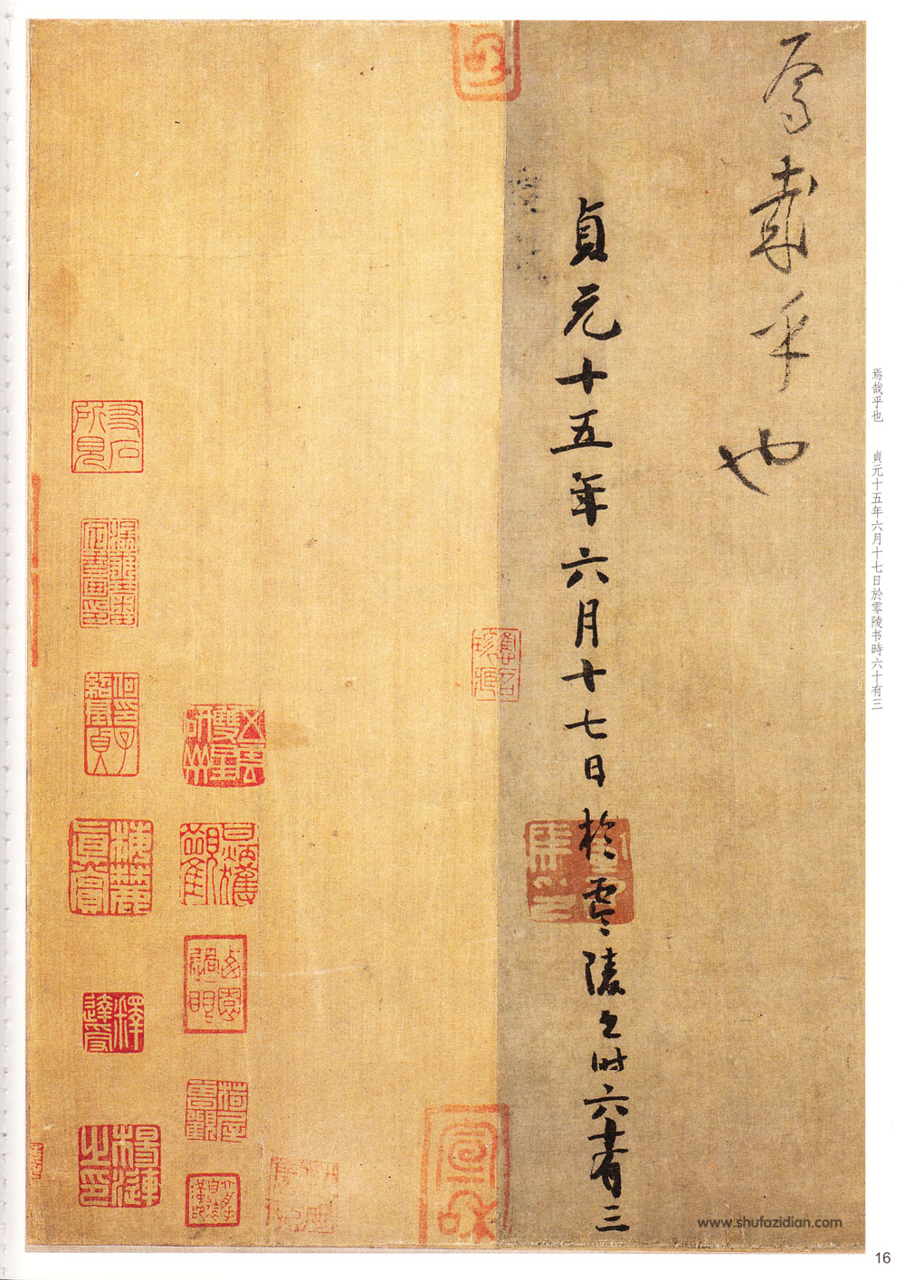 公元七九九年,年过花甲的怀素在故里零陵写就这件小草千字文。此作为绢地,共八十四行,一千零四十五字,末署“贞元十五年六月十七日于零陵书时六十有三”,故称其为小字贞元本。在其传世墨迹中,此作极为珍贵,并有一字一金之誉,故又名《千金帖》。此书平淡闲雅,笔墨意趣老辣稚拙,为其晚年代表作。此帖明代为文征明所藏,清末为六舟僧达受所藏,又归徐少圃收藏。帖前有文嘉、宋翠、毕秋帆、六舟等题签,帖后有文征明、文嘉、王文治、何绍基、阮元等来多名家题跋。这卷墨迹,规格为纵二十八点六厘米,横二百七十八点六厘米,为台湾林氏兰千山馆收藏,现寄存于台北故宫博物院。