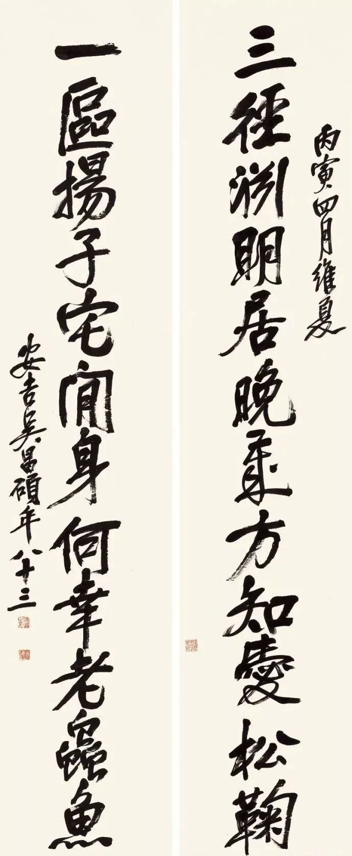 此幅行书楹联为吴昌硕八十三岁时所作。通观之,此联行书纯任自然,一无做作,下笔迅疾,痛快淋漓。虽为楹联,却有排山倒海之势。恰如其晚年时的壮心不已,因而用墨浩然,用笔豪肆,老辣苍劲,力能扛鼎,以波状线条出之,跳荡灵动,富有韵律,不计工拙,不斤斤于细部点画的描绘,从而体现出“豪迈、爽利、泼辣”的崇高之美。用笔老笔分披,穷尽变化,中锋为本,亦善施侧笔,形成苍茫高远、立体感极强的笔致。