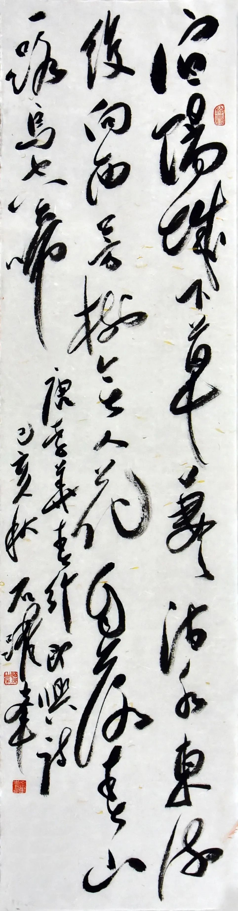 经典法帖中好的点划既美观又自然,你从石跃峰的字中,根本找不出这样的点划,无法同“遍临古帖”联系在一起,更多的是他按照自己的习气写出来的点划。这些点划不仅不美观,也不扎实,漂浮在纸面上。表面看起来他的字很有力度,其实这种力度只是大力挥运的结果。很多江湖书家就喜欢这样外露的力量,一边写一边配合着杀猪般的嚎叫。