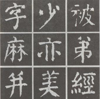 《麻姑仙坛记》中点画写法多变,形态上有方、圆、长、横、斜、挑诸多种类,但每画无不落笔峻劲,呼应庄和。右侧点是该碑中用得最多的一种,如下图中“字”字上点。这种点画状如瓜子,上光下圆,如欲滴之露,富有张力美。有时,该点略微弯曲,以显柔劲之姿。左侧点是该碑中独具特色的一种点画,其位置与右侧点一样,距离字中心较远,充分体现了颜字内松外紧的特点。如下图中“少”字左点。《麻姑仙坛记》中的点变化多样,如下图中“被”字首点以短横来替代,“麻”字上点则变为竖点,“亦”字左下点变为挑点。即使是同样的曾头点,在该碑中也是变化无穷,如下图中“弟”字上两点写成“八”字状,这是颜字的通用写法,该碑也不例外;但“并”字上两点却写成了两小撇,一出锋锐一出锋钝;到了“美”字,则又变化成“羊首法”,这是借鉴篆法的写法,使字更显生动。当有三点在—起时,它又用三小直并列来代替,如下图中“经”字左下三点;而该字的右部几点则以行书笔意将上下两点连写,使整个字显得非常灵动。《麻姑仙坛记》中的点画还有许多不同的写法,临写时一定要仔细观察,注意归纳。
