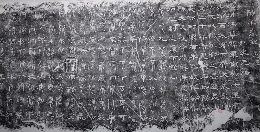 唐代瞿令问篆书《峿台铭》,元结撰文,唐大历二年(767)六月刻。据载是出自瞿令问的手笔,原石刻在湖南祁阳县峿溪崖石上,此铭书写的是悬针篆,悬针是小篆的别体,直接由玉箸篆演变而来,只是“字必垂书细末,细末纤直如悬针”。细审瞿令问的这幅篆字,我们可以用横粗直细、阔肩长足、篆法婉转、媚气四溢来槪括。