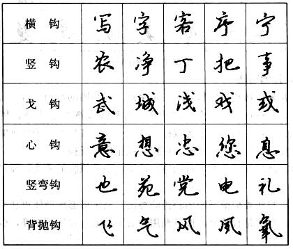竖钩:有向上钩出和水平钩出两种写法。出钩要自然有力。