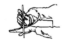 捻管法,站立写字时,适宜用捻管法执笔。手臂高悬超过笔杆顶端,使肘部、腕部、指部自上而下形成一定的倾斜度。以拇指第一节指肚由内向外捏住笔杆,食指和中指合作,上下排列捏住笔杆外侧,无名指在小指的配合下以甲肉之际由内向外抵住笔杆。用捻管法执笔,站立着书写大字和大幅作品,动作挥洒幅度大,运动自如,气局开阔,容易运用全身之力,书写自然、舒畅(如图