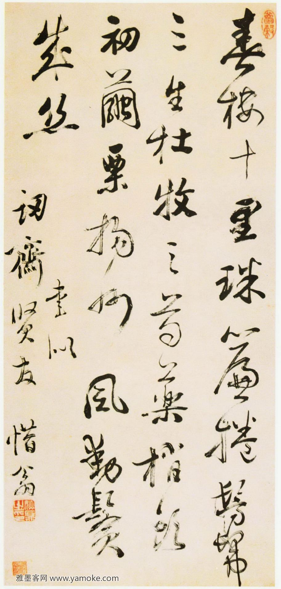 《草书七绝诗轴》,纸本。纵98.9厘米,橫36.4厘米。释文:去年南郡赏元宵,歌舞声中度画桥。烂漫新诗谁记得,红梅零落路遥遥。此书迹用笔、结构和章法娴熟,信手走笔,疾如骤雨,矫若游龙,一气呵气。只是应酬之书,常不满意,故有精粗之分,诚如当年广东书家陈献章所品评:“好到极处,俗到极处。”钤“汝弼”朱文印、“东.....