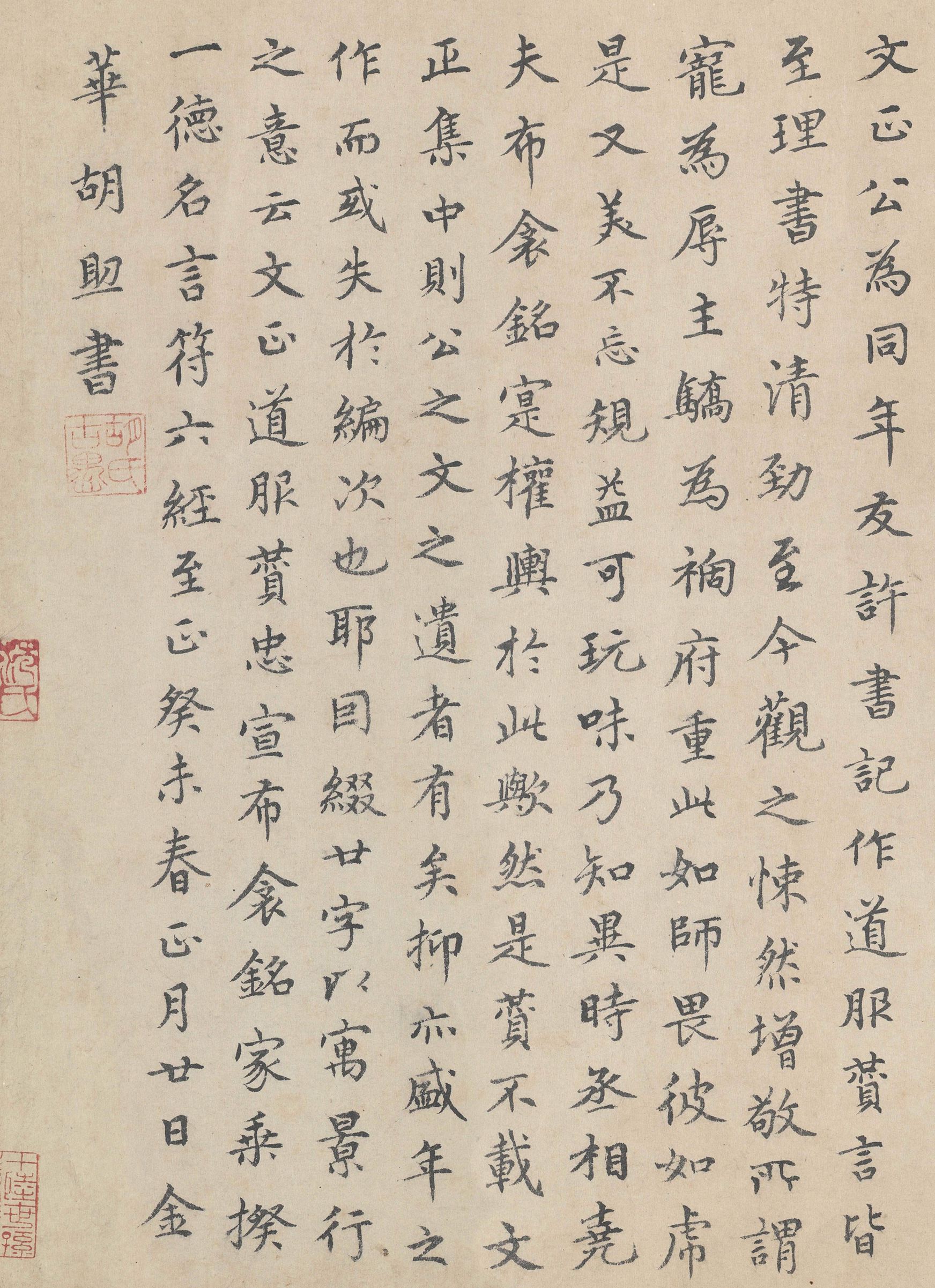 刘魁跋范仲淹《道服赞》,楷书,纵34.8cm,北京故宫博物院藏。【释文】黄山谷古今名书者犹推文正公小楷笔精而瘦劲自得古法世人可不知所重耶成化辛丑六月廿日高唐刘魁拜题...