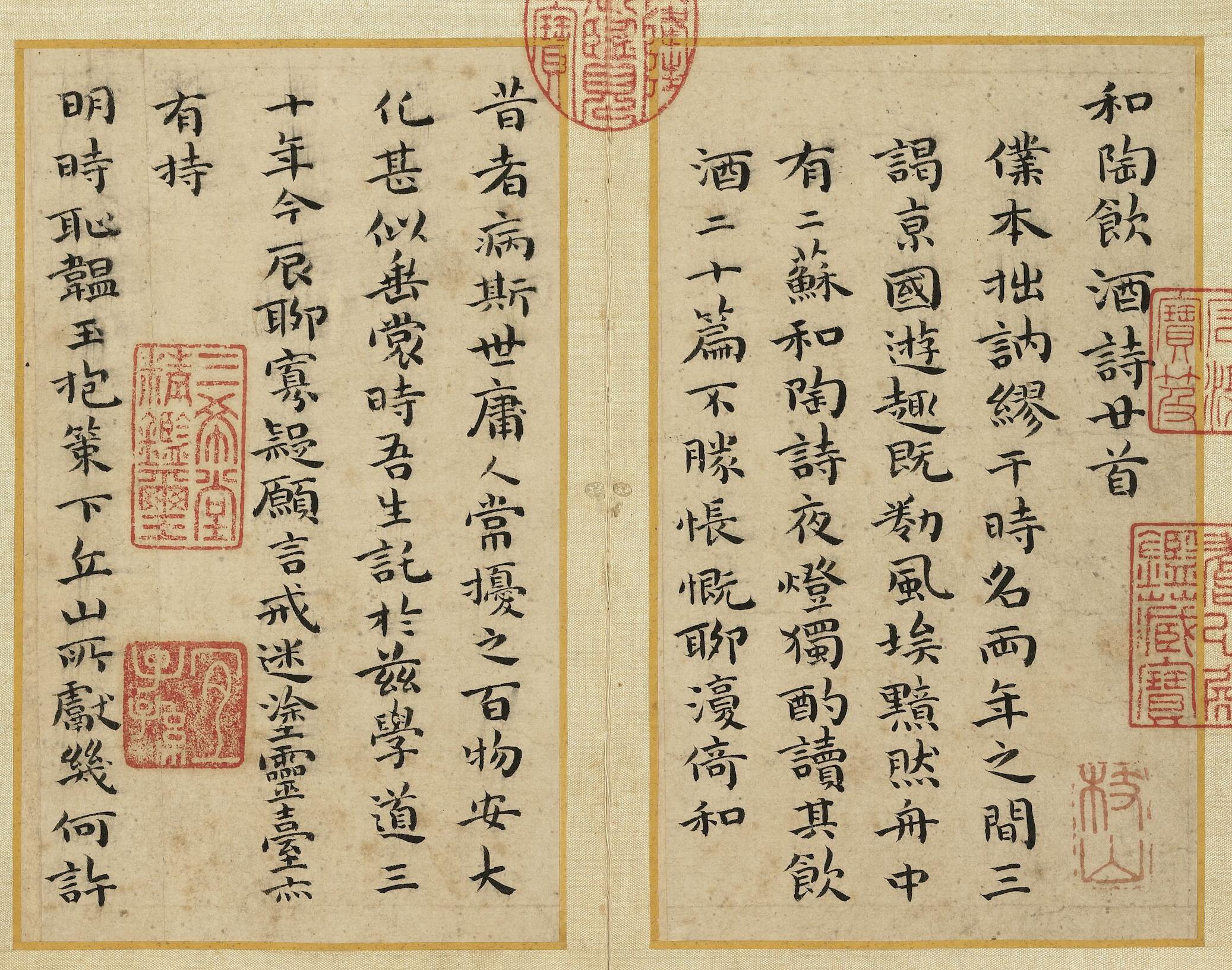 和陶饮酒诗册 01 明 祝允明 台北故宫博物院收传印:鉴藏宝玺:乾隆御览之宝,乾隆鉴赏,石渠宝笈,三希堂精鉴玺,宜子孙,养心殿鉴藏宝,嘉庆御览之宝,宣统御览之宝; 作者印记:允明,希哲,枝山;...