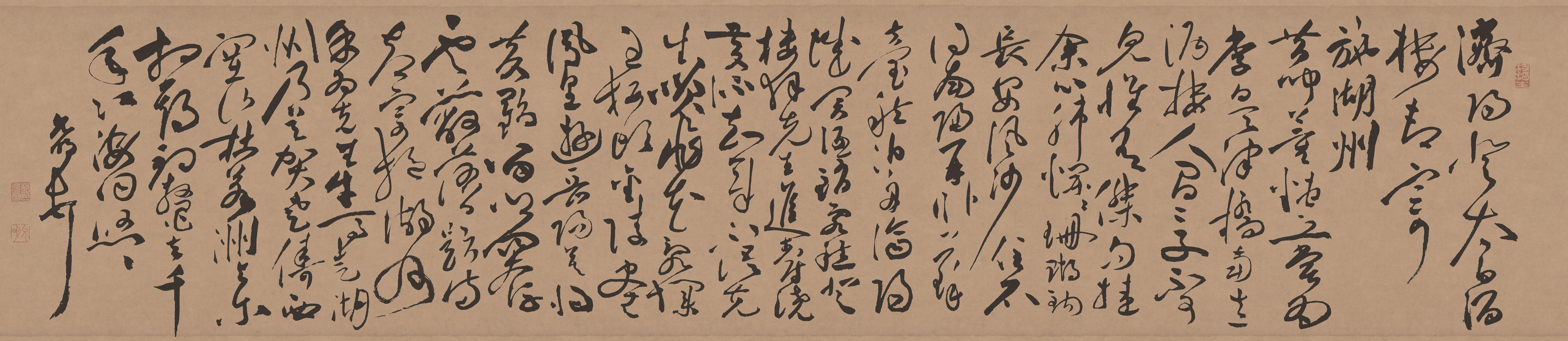 祝允明 草书诗帖《箜篌篇》纸本 36.1x1147.5厘米纸本,草书,全四篇共36.1*1147.5cm,台北故宫博物院藏。《草书诗帖》又称《手卷曹植诗四首》,此帖为曹植《乐府》诗四首中的《箜篌引》篇,书写草而不乱,情浓势足,激跃奔发,卓荦不羁。《箜篌引》释文:置酒高殿上,亲交从我游。中厨办丰膳,烹羊宰肥牛。秦筝何慷慨,齐.....